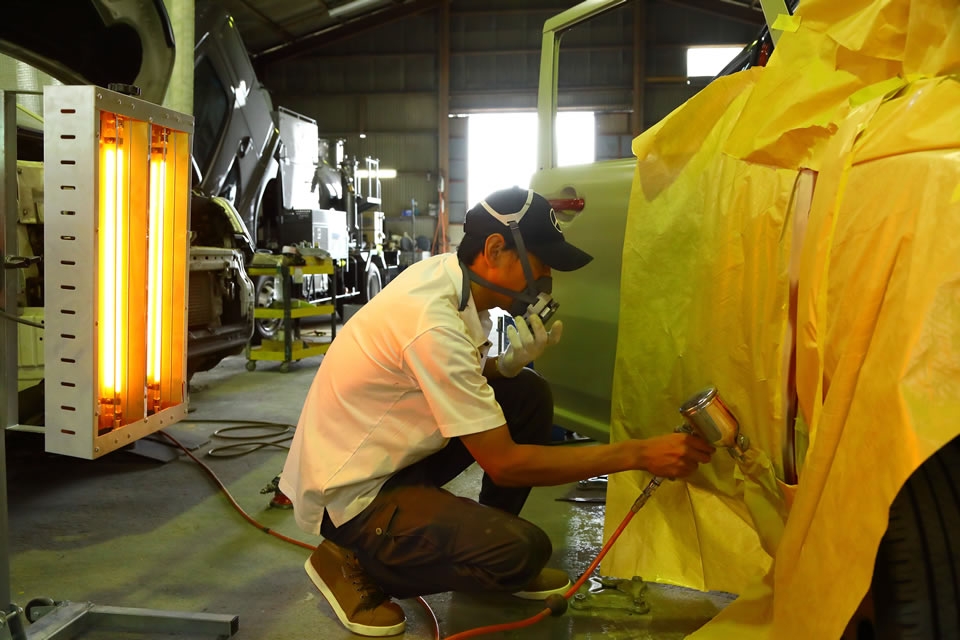 鈑金工程終了後、塗装の為に下地塗装をし、調色作業にて車ごとに色を作り出し、最新型塗装ブースで現車に似せた塗装を施します。